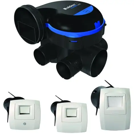 Kit EasyHome Hygro avec bouches à commande électrique. 1 piquage Ø125 cuisine et 4 piquages Ø80 sanitaires. 1 rejet Ø160. Moteur AC 1 vitesse.